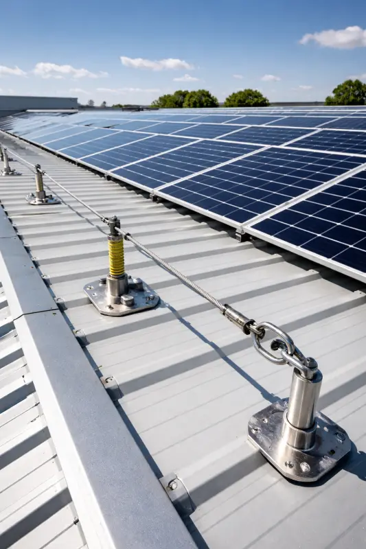 Kod solarnih instalacija, trajni lifeline sistem značajno ubrzava rad i povećava bezbednost.